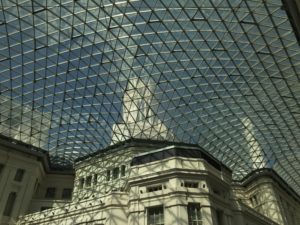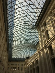 La estructura es una cáscara de una sola capa mallada con elementos triangulares, que está conectada a una viga de borde con sección circular hueca de 762 mm de diámetro y que recorre el perímetro del patio a unos 22 m de altura desde el suelo. Además, 12 cables horizontales de 45 mm de diámetro sujetan esta cáscara, para evitar la transmisión de empujes horizontales a los centenarios edificios, donde toda la estructura se apoya.