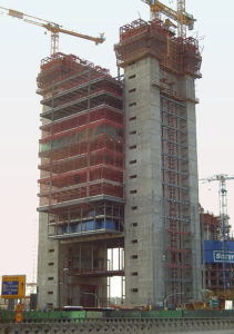 The foundation of the tower consists of a post-tensioned concrete slab, resting on top of a type of clay in Madrid called “toscos”. The allowable stress is about 7kp/cm2. There are not two slabs, one for each core, in order to avoid differential settlements between them. The foundation slab is 43x72x5 m, and the maximum settlement is 5 cm.