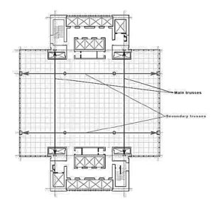 Then, 8 columns support each floor: 4 are placed in the perimeter (on the north and south facades), and 4 are interior. The loads go down these columns until they reach the bottom of the corresponding block of floors. There, loads are transferred from the columns to 2 trusses, called secondary, and placed in a north-south direction. These bear on two other trusses called primary, which are located in an east-west direction.