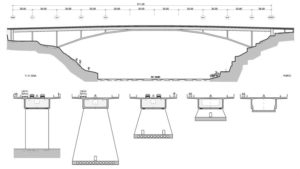 Supported every 35 m by the deck-arch link piers, the bridge deck takes the form of a box in section and has a constant height of 4.5 m and width of 11 m, with 4.5 m lateral cantilevers (box and cantilevers hereafter referred to as the “deck”).