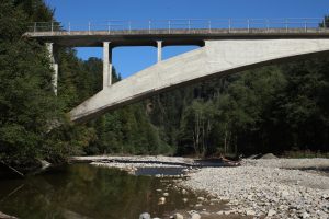 The bridge is a three-hinged reinforced concrete arch — meaning it has three joints or hinges: one at the crown (the top of the arch) and two at the supports.