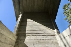 The arch was built on a wooden formwork. Once the concrete hardened, the arch and the formwork worked together to support the construction of the walls and deck. This way, the formwork was a lot lighter.