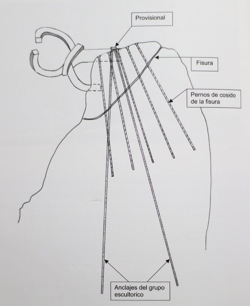 For the central sculpture, a reinforcement was made for the rock because the big holes made for the trunk and arm weakened it. Two anchors 5 m long were inserted.